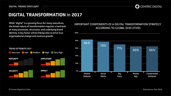 Alors le mobile à 86% fait partie des top priorités en 2017 (selon l’étude Centric Digital parue en janvier 2017) dans le cadre de la transformation digitale, suivi du social media et de la big data. Les trois sont évidemment très liés (je vous donnerai quelques chiffres justes un peu après) mais surtout, toutes ces « disciplines » sont bien entendu à considérer en tant que moyen et non en tant que fin en soi pour atteindre ses objectifs tel que l’on peut les concevoir dans un tunnel de conversion ou vis-à-vis des stratégies que je viens d’évoquer autour du magasin.