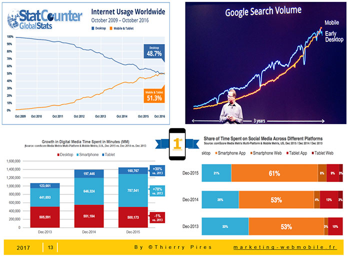 1. Parce que le nombre de mobinaute est désormais supérieur au nombre d’internaute (StatCounter Octobre 2016) (avec une croissance du trafic Web Mobile de +25% contre une décroissance de -19% sur desktop – Selon We Are Social April 2017) toutefois il faut considérer un prospect/client multi-device ;