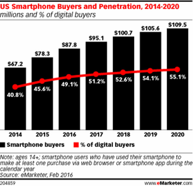 5. Le M-Commerce puisqu’en 2017 aux US, les Smartphone Buyers auront atteind 51,2% de taux de pénétration vs Digital Buyers et cette tendance franchira l’Atlantique prochainement.