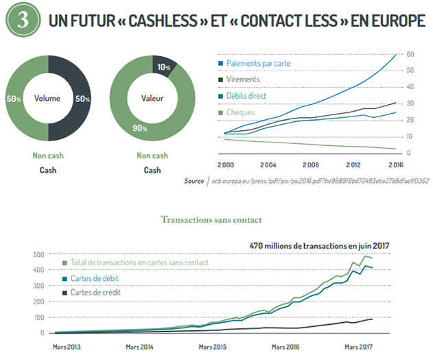 Selon la Banque Centrale Européenne, le cash représente encore 50% des échanges en volume mais à peine 10% en valeur. Le volume de paiements par carte explose tandis que les paiements par chèque disparaissent.